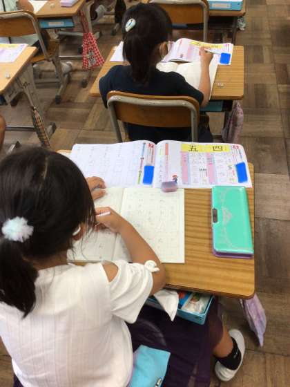 上2枚の写真は漢字ドリルの練習をしています。