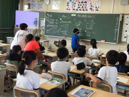 三角柱の体積をみんなで考えて求めています。