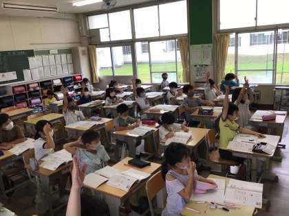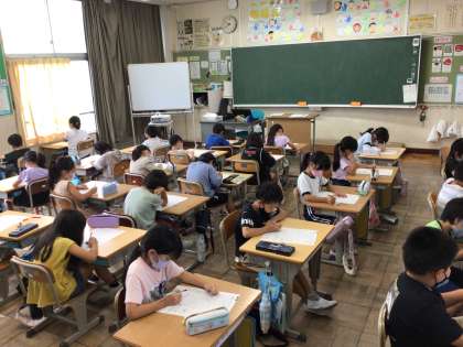 夏休みが終わって1週間がたち、いつもの学校生活を送っています。算数では百の位に繰り上がる筆算を学習しています。筆算は夏休み前にも学習しているので、応用して考えることができています。繰り上がりに気をつけて、見直しをしっかり行い、落ち着いて学習に取り組んでいます。