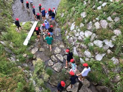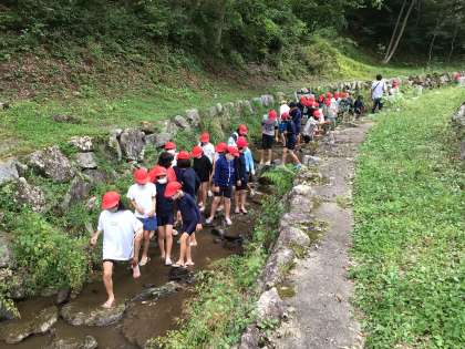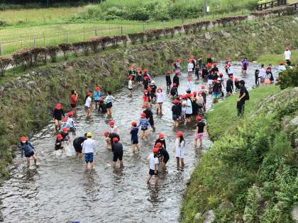 水にふれたり、川の中を歩いたり、水をかけあったりしています。