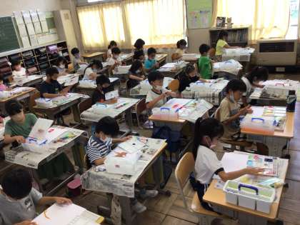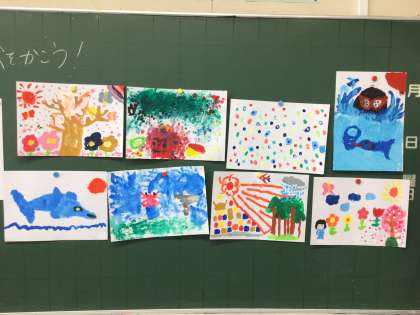2年生の図工の時間では、絵の具を筆ではなく、手や指を使って画用紙に描きました。初め「筆がないと描けないよ!」と言っていた子どもたちが、いざ絵を描き始めると夢中になって描いていました。筆では、表せない模様や表現がある素晴らしい絵を描くことができました。