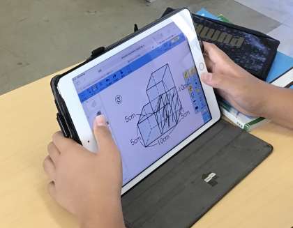 タブレット上で図形に書き込みながら、問題を解いています。