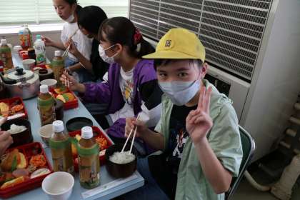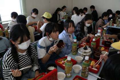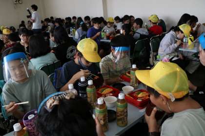 法隆寺を見学していると、朝早くから集合して出発したこともあり、「お腹が空いた」という子が多く出てきました。見学が終わってすぐに、法隆寺の近くの松本屋というお店で昼食をとりました。感染対策のため、黙食を徹底しながらも、おいしそうに昼食を食べていました。