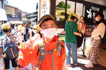 修学旅行最後の活動は、お土産屋さんの立ち並ぶ二寧坂・産寧坂でのグループ行動。家族へのお土産を購入する子や友達とおそろいのキーホルダーを購入する子、最後の最後まで楽しく活動を行っていました。子どもたちは、楽しみながらも時間などのきまりをしっかりと意識して活動することができており、修学旅行の中でも成長する姿が見られました。この遊学旅行での学びを、これからの学校生活に生かしていってほしいです。
