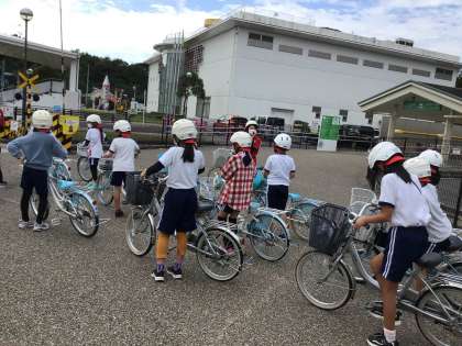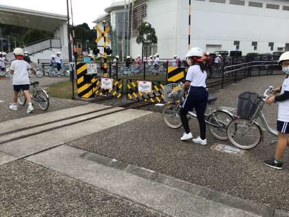 自転車に乗る時には右左だけではなく、後ろから来る車にも注意しなければならないことを知りました。自転車に乗る体験を行い、周囲の安全に注意して横断歩道を渡ったり、踏切を渡ったりしました。