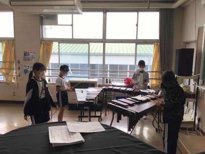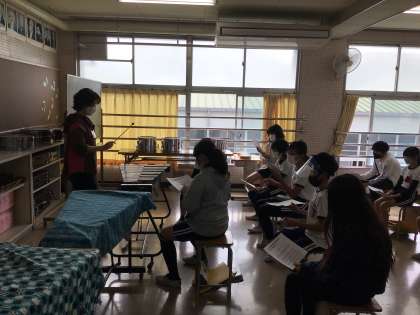 今日の授業では、最初に音楽の先生から、それぞれのパートの演奏方法を聞いた後に、各グループに分かれて練習を行いました。