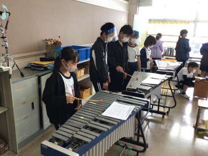 5年生の音楽では、「リボンのおどり」の器楽合奏を行っています。