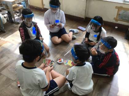 持ち札を見せてルールを教えてあげる子やこのカードを1年生に回すのはなあと困っている子、低学年の子が難しいバランスをクリアしたので必死になっている子など、温かい空気が流れていました。