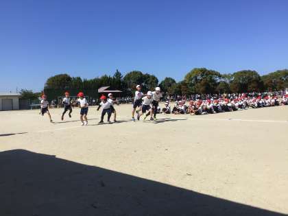 バトンパスを初めて行います。一人一人が全力で走り、クラスのためにバトンをつなぎました。