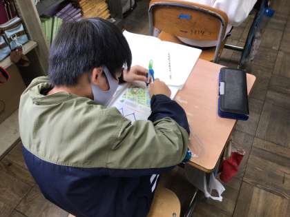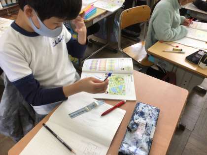 3年生算数科の学習では、コンパスを使っています。コンパスを使って、円をかいたり、長さを写し取ったりしました。
