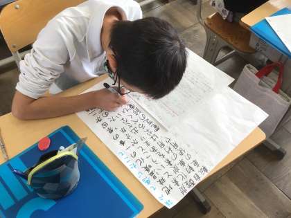 黙々と自分の原稿を書いている子やアドバイスし合って書いている子、先生に相談している子など、自分の方法で学習を進めていました。