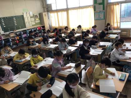 国語では、自分の宝物を紹介するために、文の構成を考えて準備をしています。はじめ、中、終わりで書くことを分け、分かりやすく伝わりやすい文を書いています。書いた文はみんなの前で発表する予定です。
