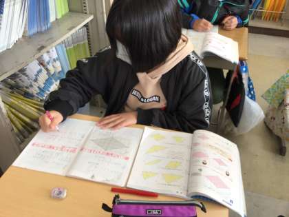 ひし形の面積の求め方まで終わると、今まで習った三角形、平行四辺形、台形などの面積の求め方について復習をしました。
