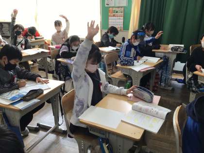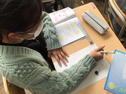 この日は5年4組で、既習事項の面積の求め方の復習が行われました。どの子も、既習の求め方を確認しながら、真剣に問題に向き合っていました。