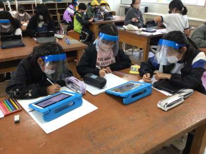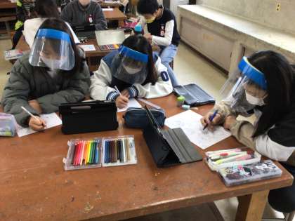 この写真は、イラストクラブの様子です。お気に入りの絵をタブレットで調べて、紙に描いています。