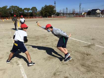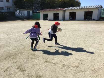 体育では現在タグラグビーを行なっています。初めてさわるラグビーボールに悪戦苦闘したり、1対1でタグを取られないように工夫したりしながら取り組んでいます。