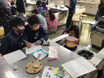どの子も、鍋でご飯が炊き上がる様子を真剣に見て、ノートにまとめていました。