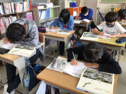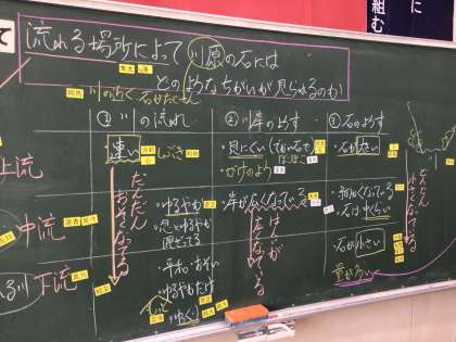 上流・中流・下流それぞれの場所の「川の流れ」「川岸の様子」「石の様子」について、理科ノートに各自調べた後、話し合いをしました。話し合いへの参加度も素晴らしく、全員発言もできていました。