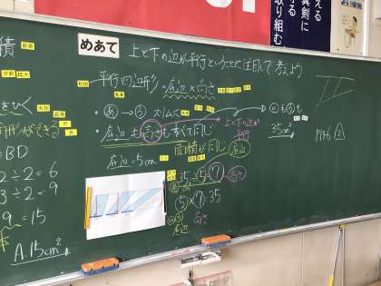 5年2組では今日の算数で、上と下が平行になっている線の間にある平行四辺形の特徴について考えました。話し合いでは、どの平行四辺形も底辺の長さが同じで、高さも同じ長さであることから、面積は同じであることに焦点化されました。