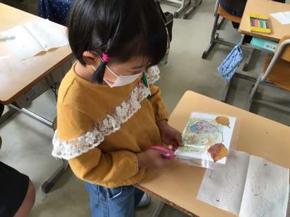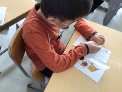 先週つくった押し葉を使用してカードづくりをしました。様々な色の落ち葉でつくった押し葉を並べて、絵を描いたり模様を描いたり…完成したらラミネートして、みんなとっても素敵なカードが完成しました。
