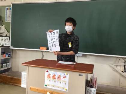 残念なことに授業参観が開催できなくなってしまったため、子どもたちの様子を知っていただこうと各学年が動画を作成しています。6年生は「修学旅行の思い出俳句と理想の6年生像」を発表する様子を動画にしています。習字で書いた俳句を見せて発表するため、何度も書き直したり、文章を一生懸命考えたりして発表にのぞんでいます。
