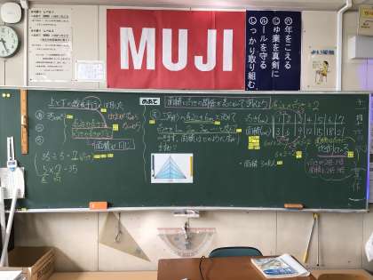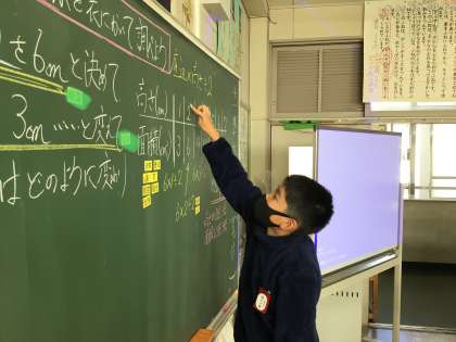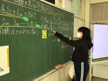 この日の5年2組では、底辺は変わらないけど、高さが1センチ、2センチ、3センチと変わっていく三角形の面積と高さの関係について調べました。