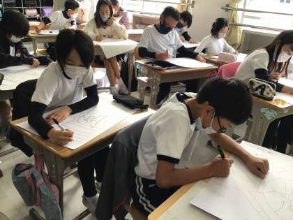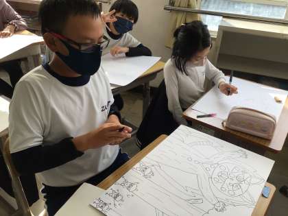 下絵の紙を見ながら、画用紙に丁寧に描いています。