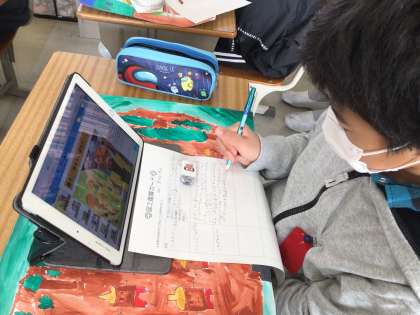 タブレットの発表ノートを使って鑑賞をし、友達の絵の素敵なところをたくさん見つけることができました。