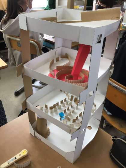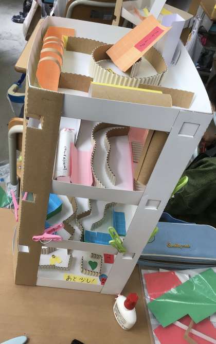 ビー玉が転がる様子を想像したり、出来上がってきたら試しにビー玉を転がしてみたりしながら楽しそうに真剣に作製していました。