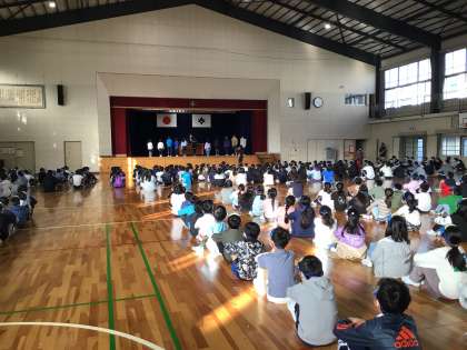 今回はリモートでなく、体育館でにじいろ集会に参加しました。