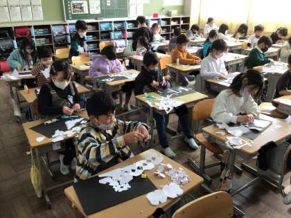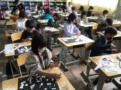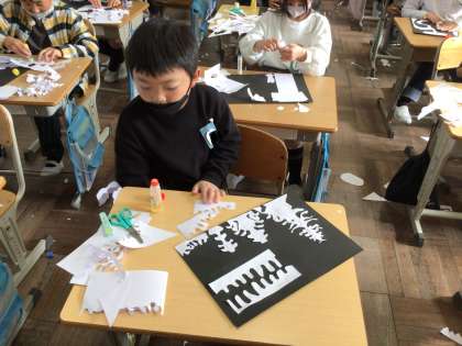 今日の図工は、ハサミを使って白い画用紙をいろいろな形に自由に切りました。そして、いろんな形の白い画用紙を黒い画用紙の上に並べ、思い思いの作品を作りました。一年生の頃に比べて、ハサミやのりの使い方が、上手になっていました。
