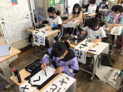 冬休み明けに行われる書き初めに向けて、先週より練習を始めました。今は、文字のバランスを知るため、手本の文字をなぞるところから始めています。