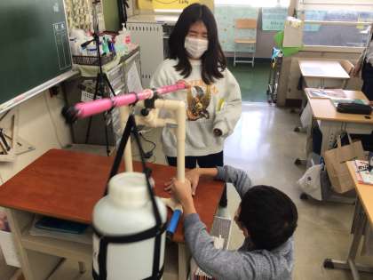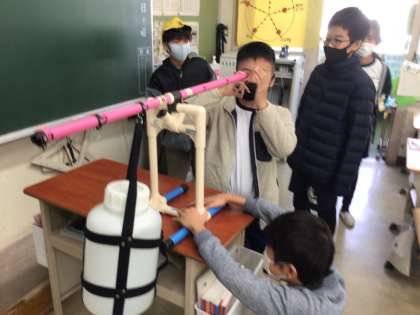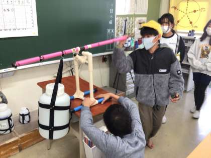 理科は「てこのはたらき」の単元に入っています。重りをかける場所によって重りを持ち上げる手応えが変わるのか全員が実際に持ち上げて確かめました。また、身近にあるてこの原理を利用したものについて考えました。