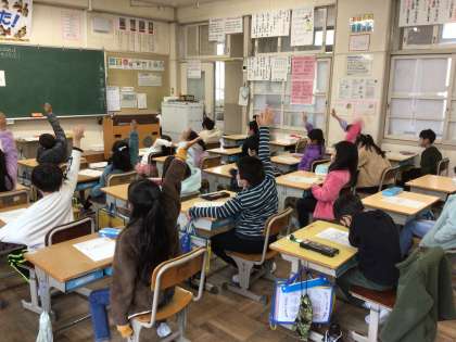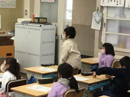 いろいろな教員が見守る中、研究授業として算数科「ものとひとのかず」の学習をしました。問題の「なんばんめ」かを求めるために、実際に並んでみたり図をかいたりして答えを求めました。子どもたちは、大きな声で自分の意見を言ったり、姿勢よく友達の話を聴いたりすることができ、とても立派な姿でした。