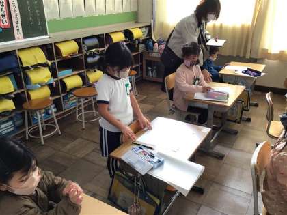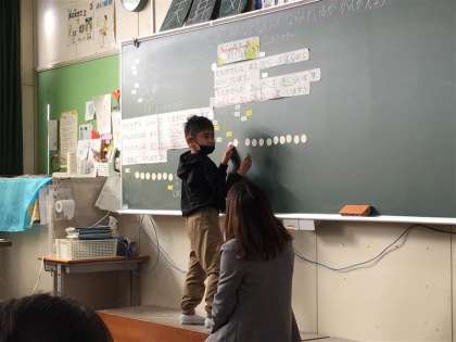 1組に続き、4組でも研究授業が行われました。問題の「みんなでなんにん」かを求めるために、図や式を使いました。これまでに学習したことを生かして、◯や●を使った図を自分の力でかけた子がたくさんいました。授業の最後に今日の授業でわかったことを書きました。1年生とは思えないほど、たくさんの文を書いていました。