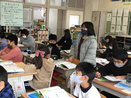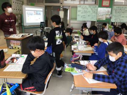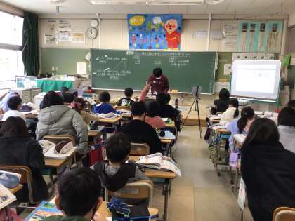この写真は、5年1組の様子です。今日は、中小工場の役割について考えました。働く人、生産額といった視点で、大工場との違いを考えました。