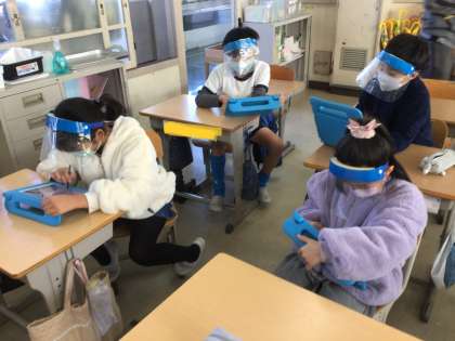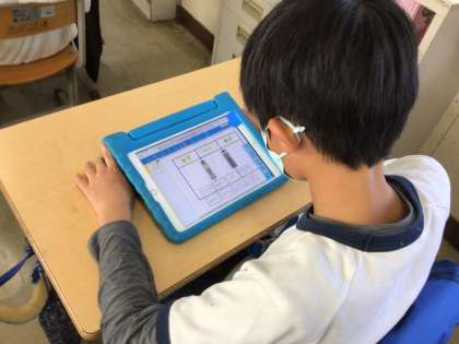 タブレット上のワークシートで、「男・女・どちらとも」の変化かを自分で考えた後、友達と相談しています。