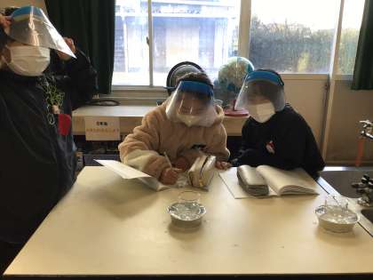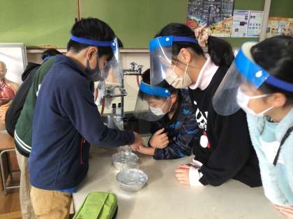水溶液に溶けている食塩やミョウバンを取り出す実験を行いました。「うわあ、食塩が出てきたー」という歓声が教室中に響き渡っていました。