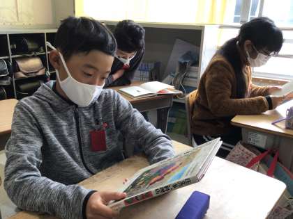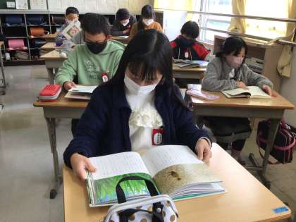 12月20日(火)、5年3組では、注文の多い料理店以外のお話で「おもしろ表現」を見つけるために、読書を行いました。どの子も、自分が選んだ本を黙々と読んでいました。