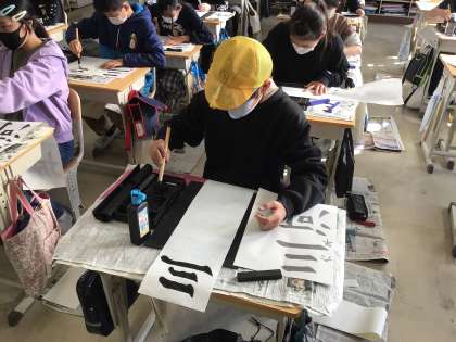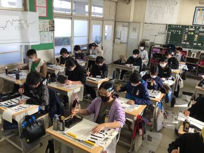 3組の書き初め大会の様子です。声ひとつない静まり返った環境の中、集中して取り組んでいます。どのような作品が仕上がるか楽しみです。