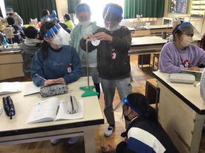この日は5年4組で、ふりこは1往復する時間について、実験をしました。グループで協力し合って、実験に取り組んでいました。