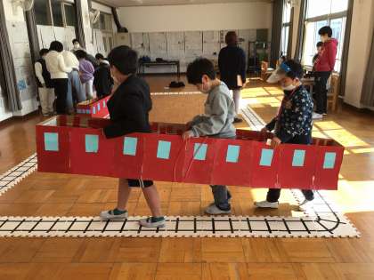 12月に楽しく擬似体験活動をした「電車でGO!」。全部の駅を回りきれなかったり、欠席した子のために、もう一度電車を走らせました。上手に体験ができました。