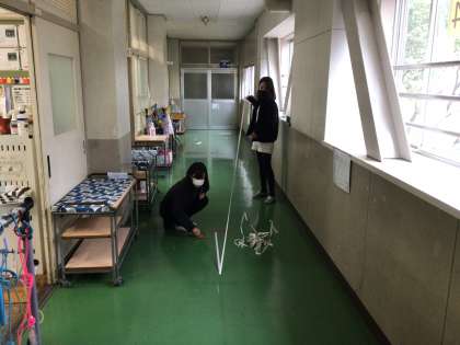 廊下を安全に歩行できるよう、中央線の整備を行っていました。