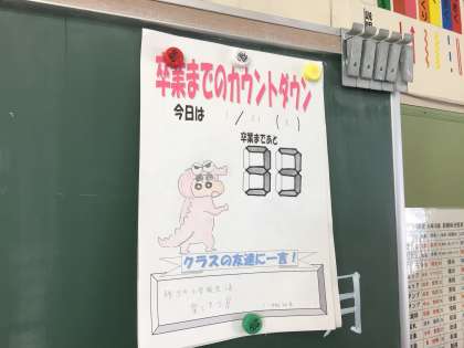 6年3組では今日から卒業カレンダーがスタートしました。卒業まで残り33日(平日のみカウント)です。教室でも卒業を意識する話題が多くなり、さみしがったり、期待を膨らませたりしています。中学校に向けてラストスパートをかけ、大きく成長する6年生に期待です。