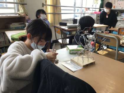 5年生の図工で制作しているワイヤーアートの作品が、どのクラスも完成となりました。