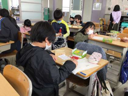 他の子の作品の素敵なところを見つけ、ワークシートにまとめていました。
