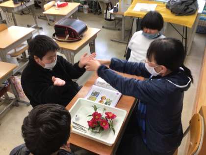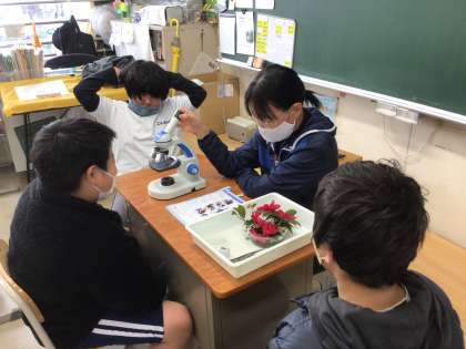 理科の授業で、花のつくりや顕微鏡の使い方を学んでいます。 ことばのきまりを行っています。
