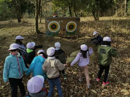 落ち葉遊びをしたり、木の実を使って的当てゲームをしたりしました。