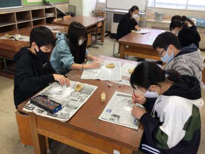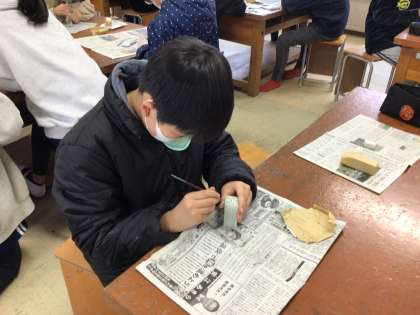 6年生の最後の図工はオリジナルはんこ作りです。自分の名前の一文字を石に刻んでいます。細かい作業に悪戦苦闘しながらも一生懸命取り組んでいます。完成をお楽しみに!