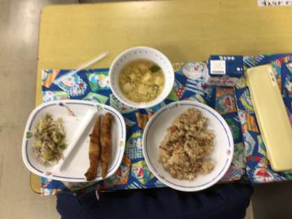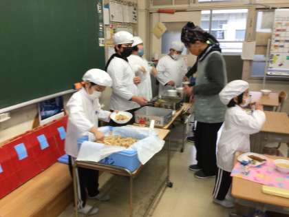 給食の準備中です。 頑張っています。 今日のメニューは?